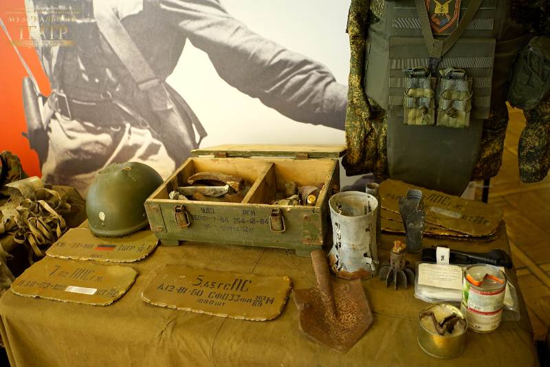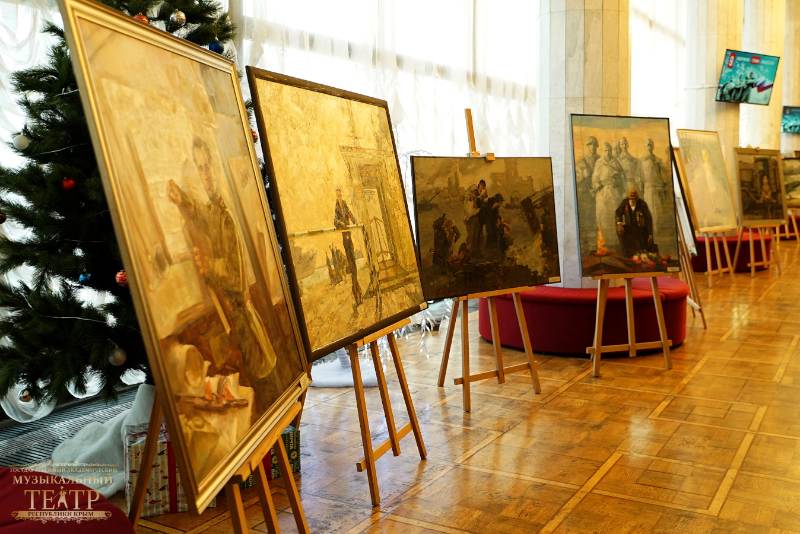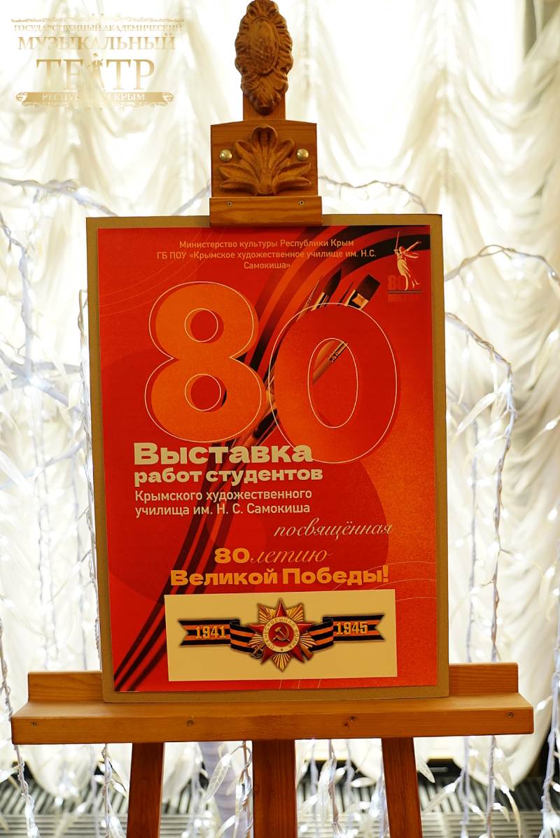 В фойе второго этажа зрителей встречала выставка работ студентов Крымского художественного училища им. Н.С. Самокиша, посвященная 80-летию Победы. А также инсталляция, подготовленная Центром народного творчества Республики Крым, на которой представлены оборудование и предметы быта солдат.