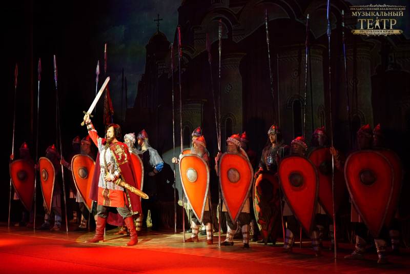 Артисты крымского музыкального театра представили фрагмент из эпического мюзикла «Александр Невский», премьера которого состоялась 30 апреля. Этот спектакль театр посвятил 80-летию Великой Победы. В роли Александра Невского – заслуженный артист Республики Крым Владимир Кудрявцев. Александр Блинов исполнил музыкальную композицию «Смуглянка». Виктор Феклушин выбрал для выступления «Песню о далёкой Родине» из культового фильма «Семнадцать мгновений весны».