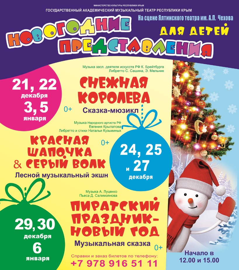 Праздник будут создавать артисты Государственного академического музыкального театра Республики Крым, которые представят юным зрителям давно полюбившиеся и совсем новые сказки. Детвору ждут замечательные сказки: «Снежная королева» (21 и 22 декабря, 3 и 5 января в 12:00 и 15:00), «Пиратский праздник — Новый год» (29 и 30 декабря, 6 января в 12:00 и 15:00) и долгожданная премьера — лесной музыкальный экшн «Красная Шапочка и Серый Волк», музыку к которому написал замечательный композитор Евгений Крылатов (24 и 25 декабря в 12:00 и 15:00, 27 декабря в 15:00).