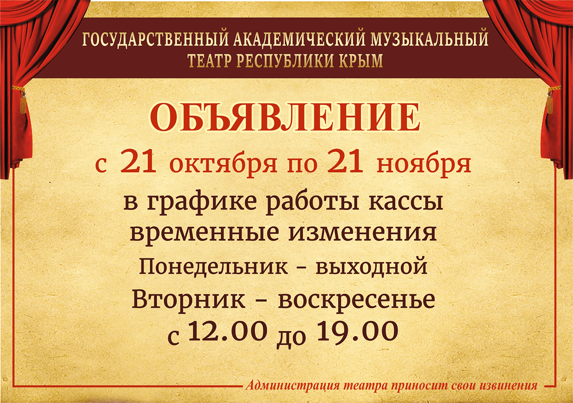 Уважаемые зрители! Обращаем ваше внимание на временное изменение в режиме работы кассы музыкального театра.